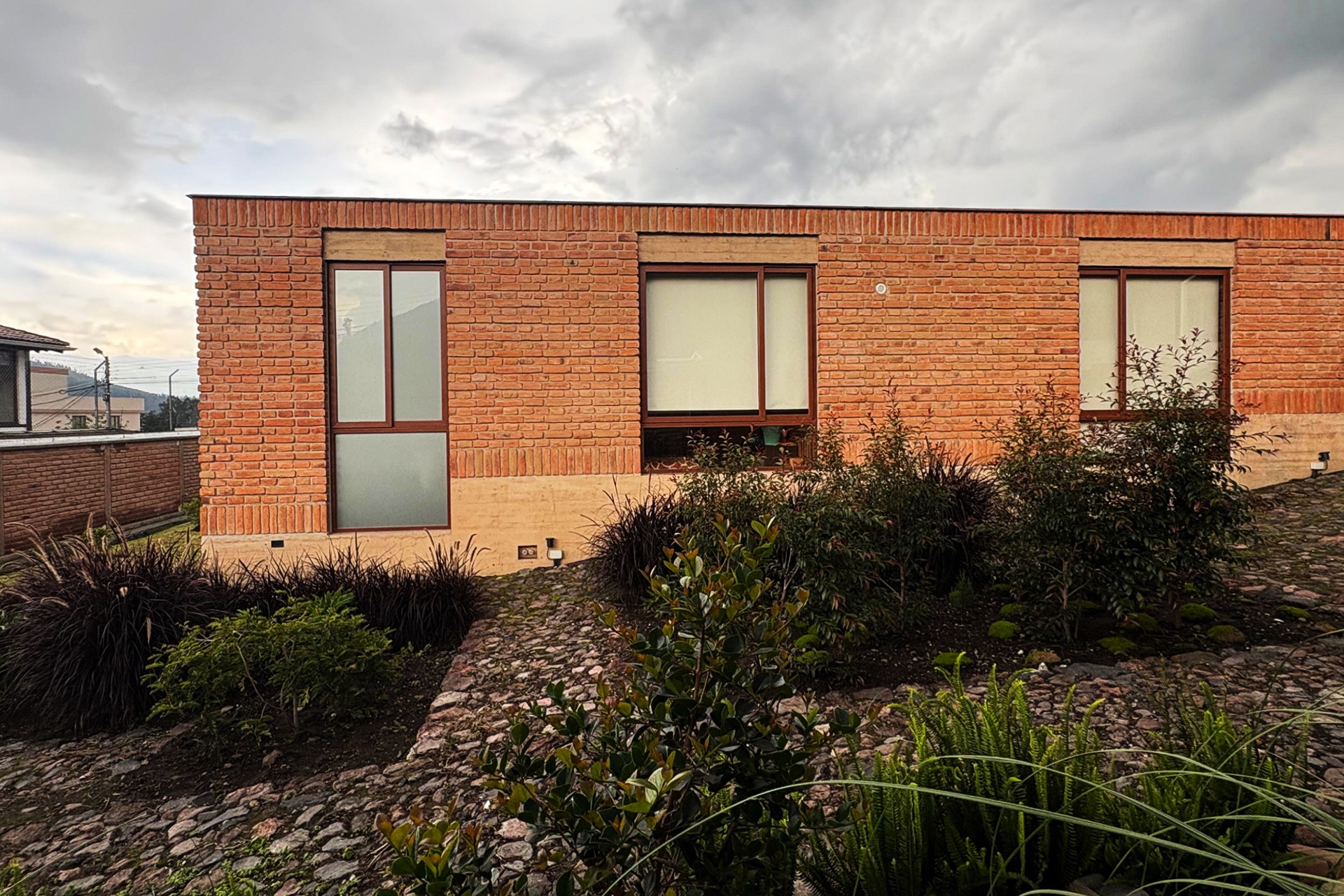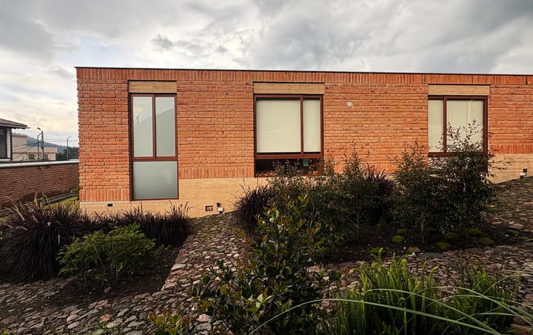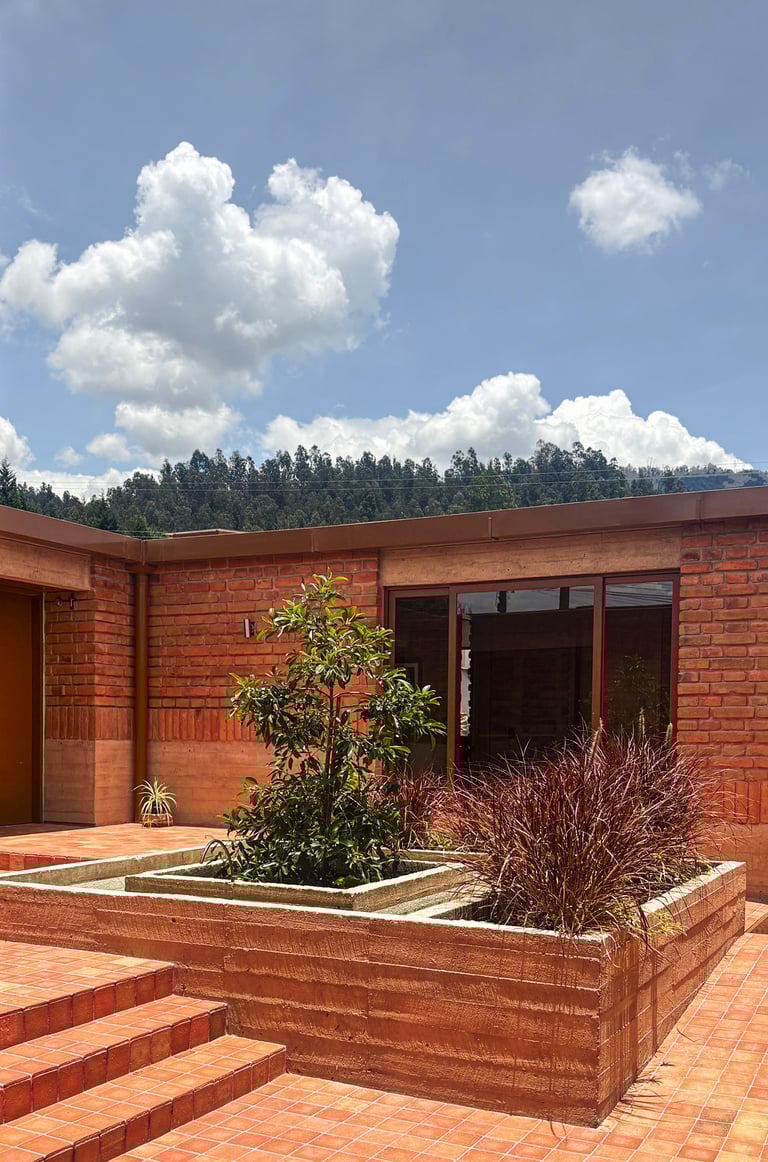 El sistema estructural es mixto. La cimentación se resuelve con cimentación corrida de hormigón ciclópeo, sobre la cual se levantan muros portantes de hormigón armado encofrado in situ y muros estructurales de ladrillo artesanal. Este ladrillo queda expuesto tanto en exteriores como interiores, cumpliendo una función estructural y expresiva.