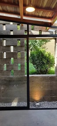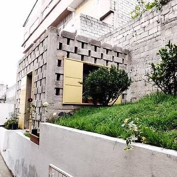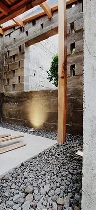 La intervención explora tipologías básicas de envolventes. Hacia el exterior, se construye con mampostería de bloque de concreto colocada en traslape, generando ritmo visual, ventilación cruzada y una relación directa con el cerramiento del solar y el contexto vecinal.